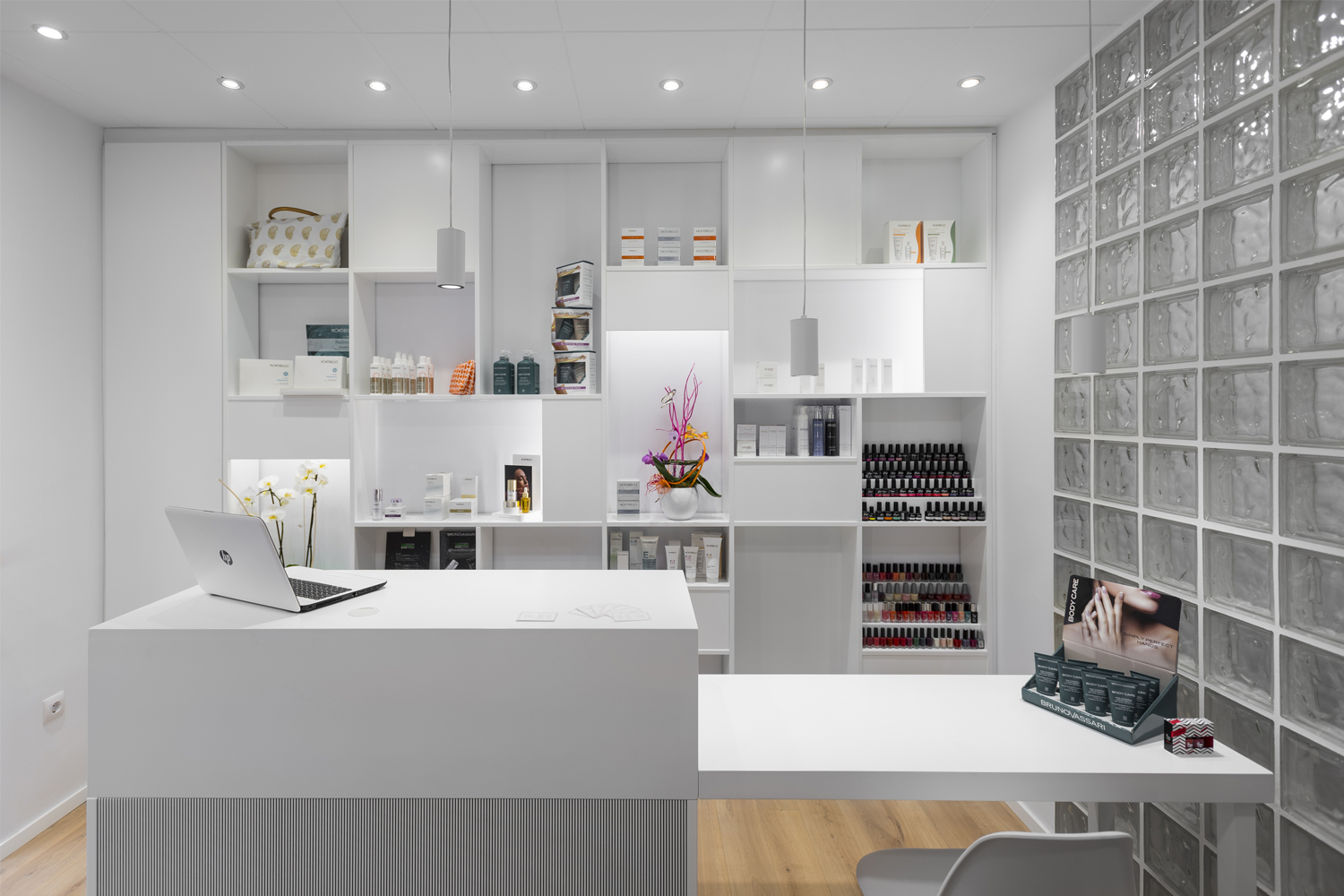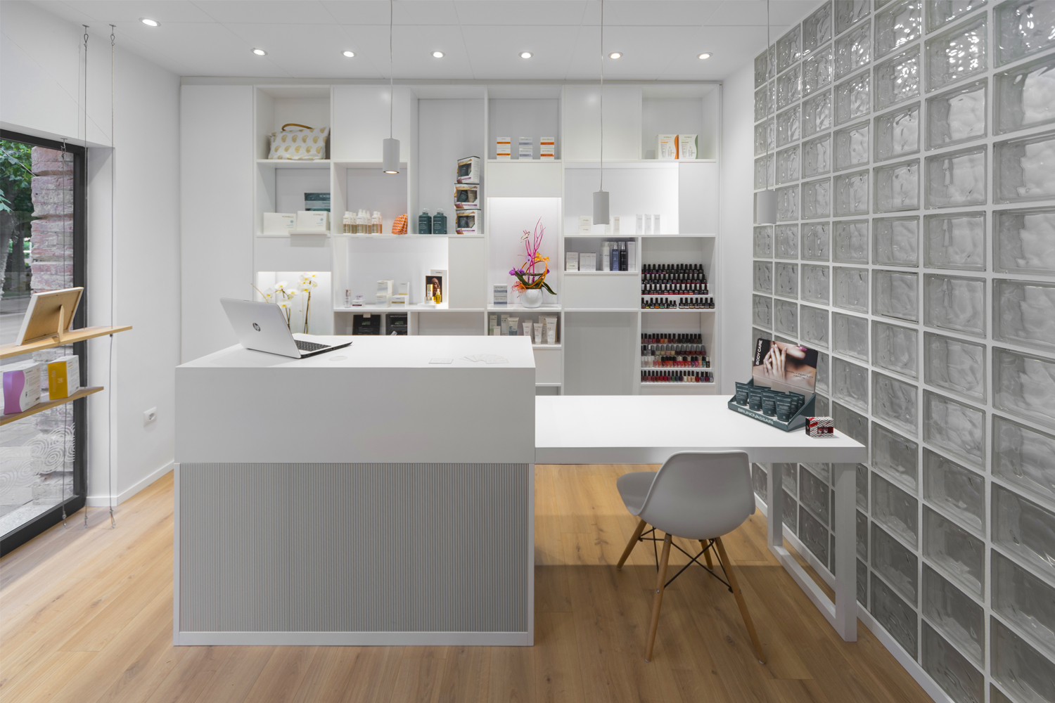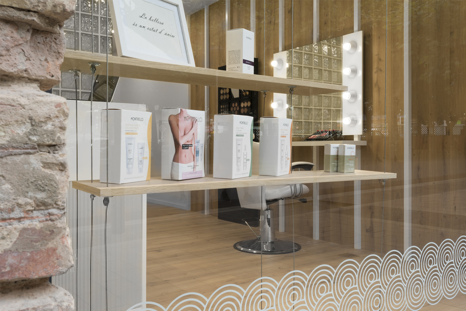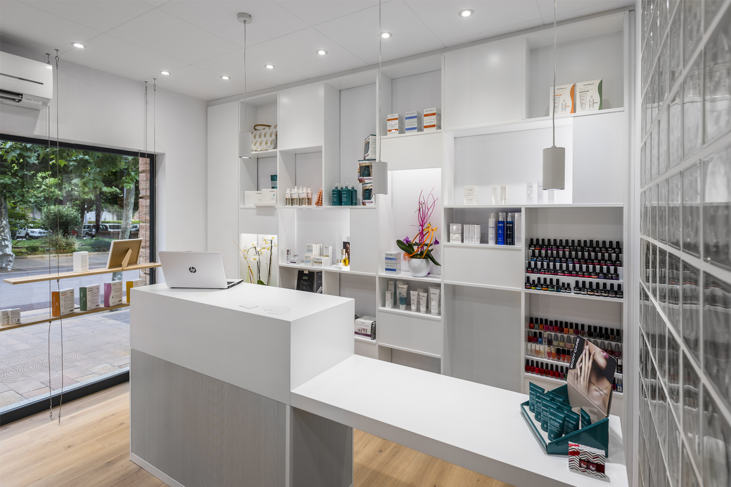 El taulell és l’element central, un punt de confluència, espai de benvinguda, d’atenció i de venta. El segon element potencial del projecte és la prestatgeria com a expositor, 100% visible des de l’exterior, creant un ritme de nínxols aleatori i de diferents dimensions. La sala interior es manté com espai de tractaments corporals. L’element aparador s’ha previst com un element de suport amb la mínima essència, donant prioritat el producte exposat.