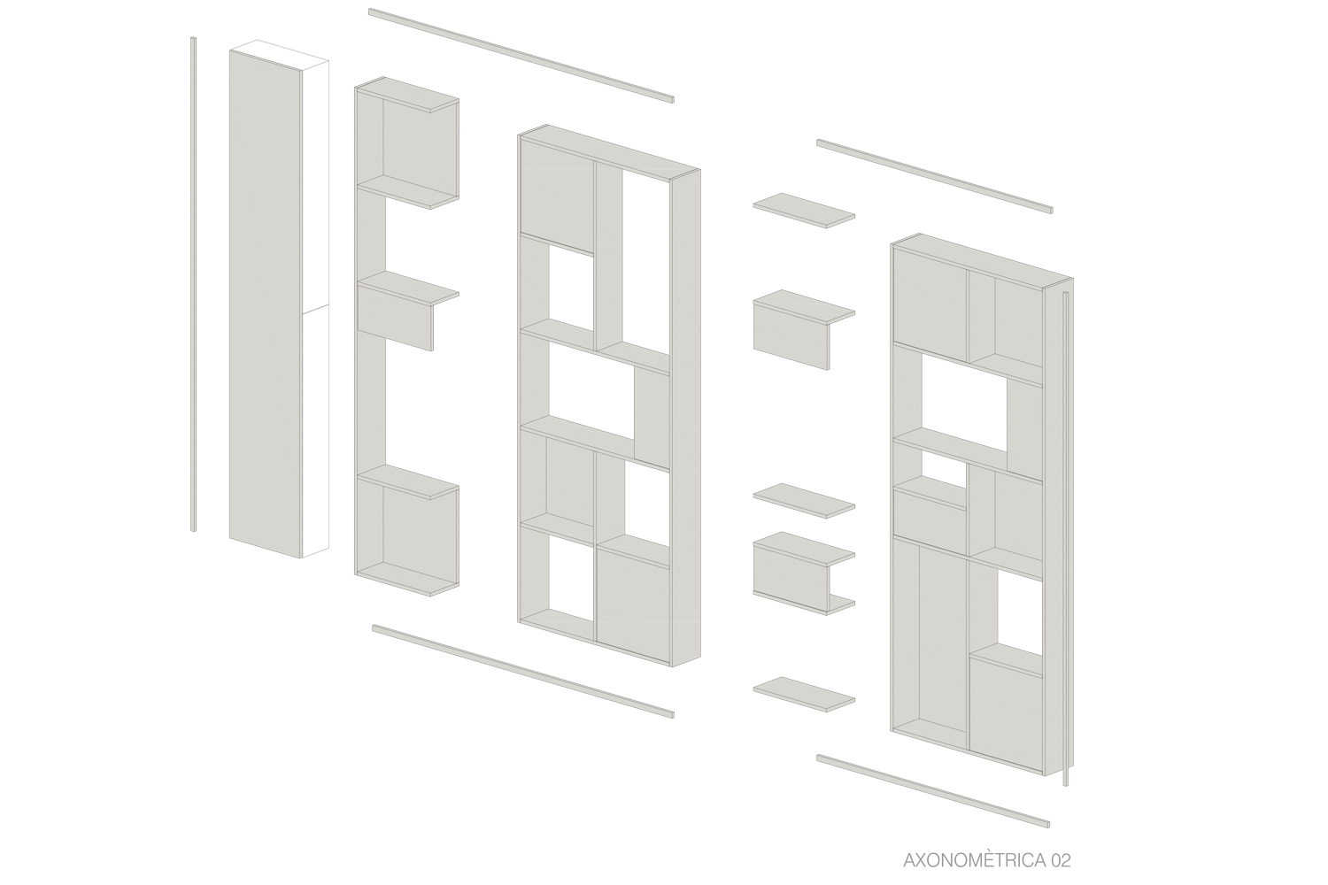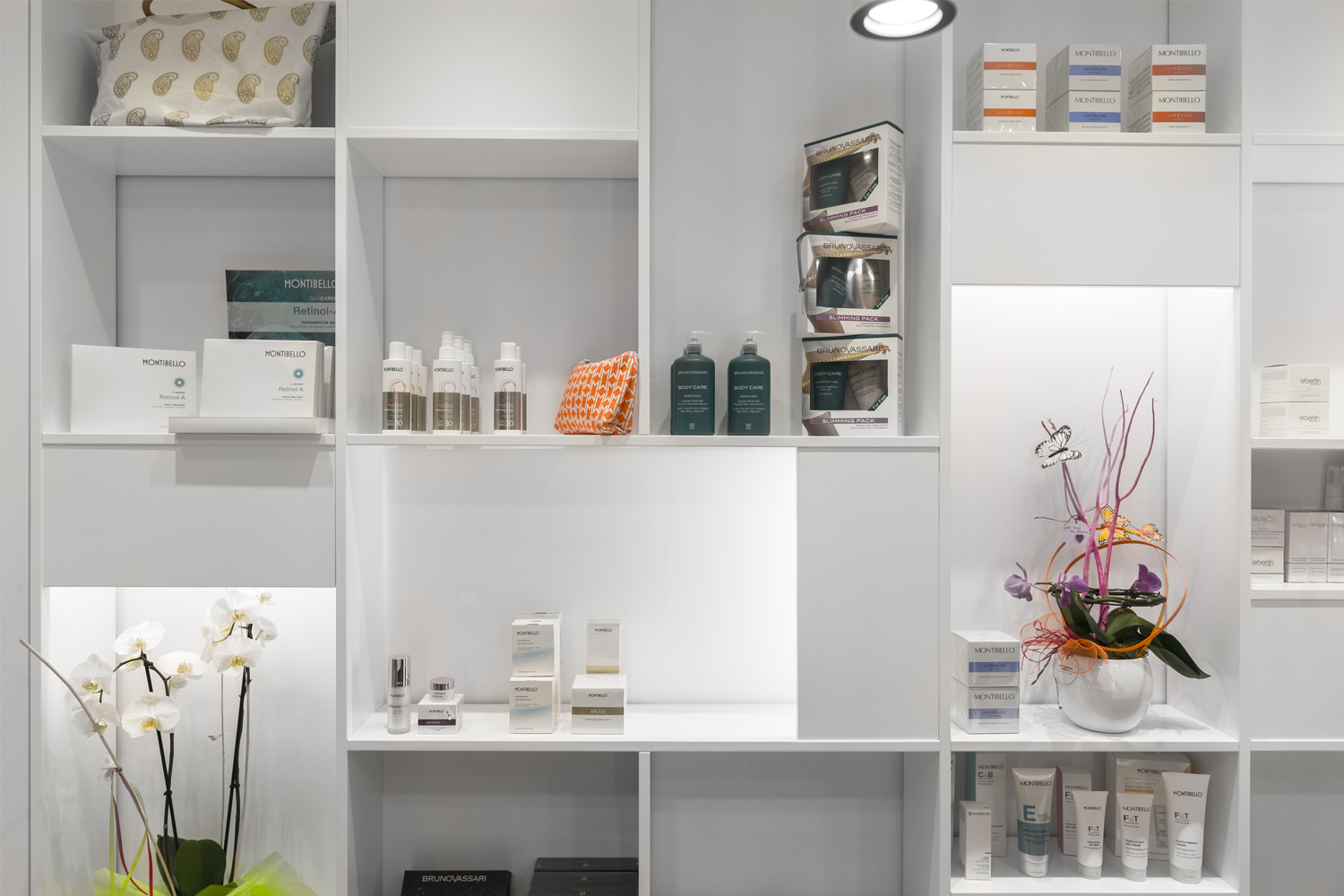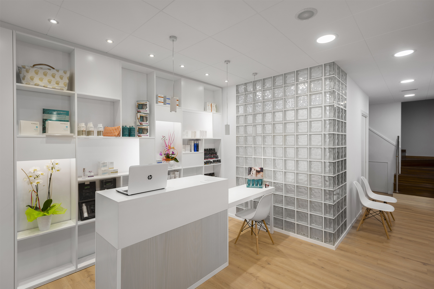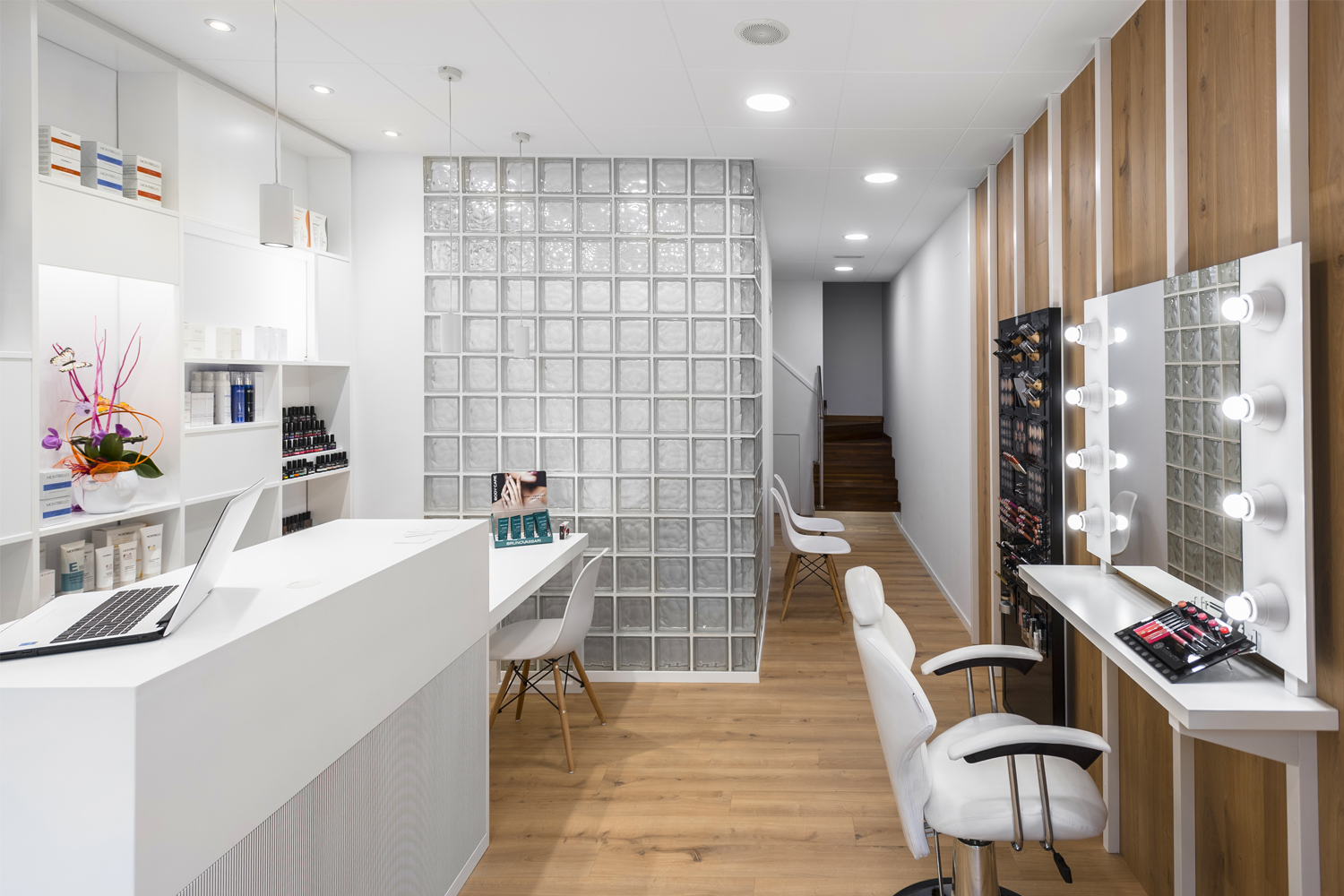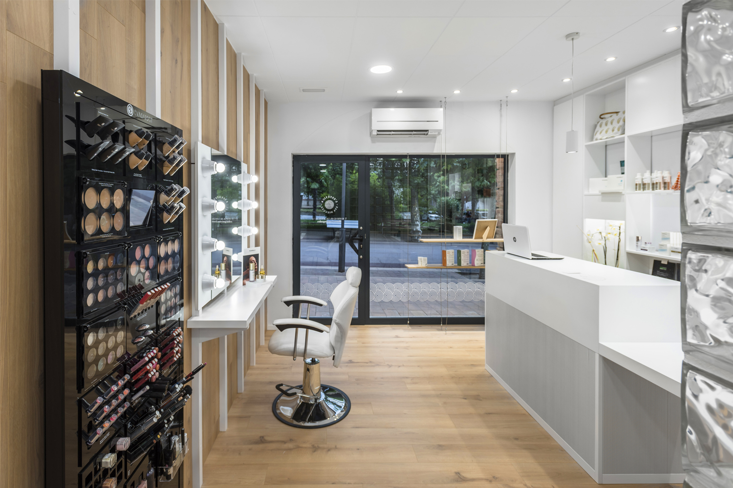 El taulell és l’element central, un punt de confluència, espai de benvinguda, d’atenció i de venta. El segon element potencial del projecte és la prestatgeria com a expositor, 100% visible des de l’exterior, creant un ritme de nínxols aleatori i de diferents dimensions. La sala interior es manté com espai de tractaments corporals. L’element aparador s’ha previst com un element de suport amb la mínima essència, donant prioritat el producte exposat.